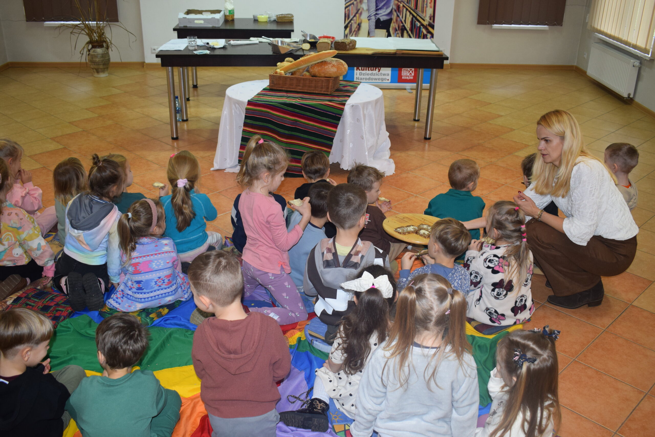 Spotkanie było nie tylko edukacyjne, ale przede wszystkim wciągające i zabawne. Dzieci z entuzjazmem uczestniczyły w zajęciach, zadając pytania i dzieląc się własnymi doświadczeniami kulinarnymi. Pod koniec warsztatów każdy uczestnik otrzymał mały bochenek chleba, który samodzielnie przygotował.